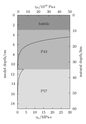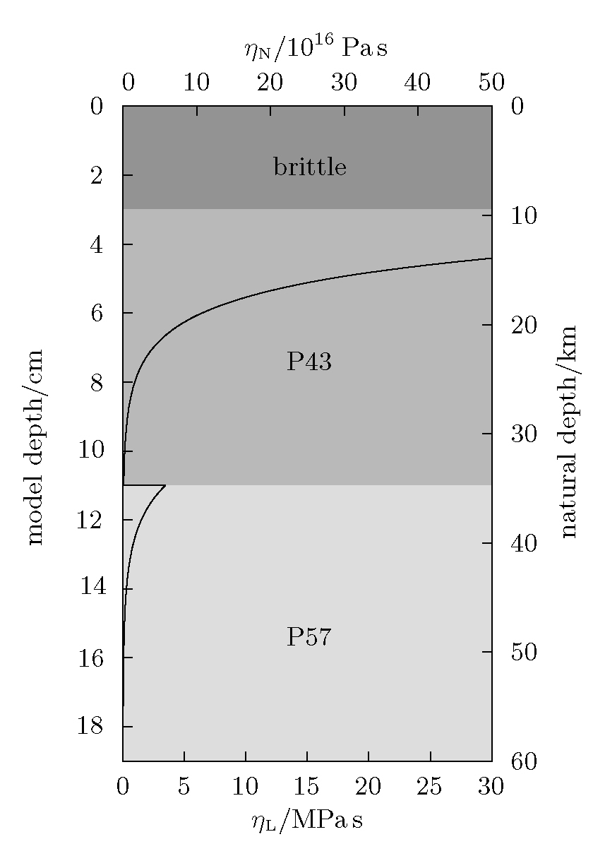 The mean densities of the upper and lower crust are 2800 kg/m3 and 3300 kg/m3, respectively (Fowler, 1990). The densities of the according analogue materials Jet-Plast and paraffin wax are 736 kg/m3 and 882 kg/m3. The resulting scaling factor for density Sρ = 0.26 applies for both upper and lower crust. Using equation 2.6 and 2.7, scaling factors for viscosity and stress are found to be Sη=10-16 and Sσ=8x10-7. The scaling factor for viscosity can be used to determine the viscosities needed in the analogue model. For this, the viscosities of natural rocks must be calculated from published flow parameters and an assumed geothermal gradient. Using a geotherm of 20°C/km typical for a convergent collisional orogenic setting (e. g. Decker et al., 1988), a wide range of viscosities can be found. Basing on parameters from Carter & Tsenn (1987) for "wet" dunite and a temperature of 720°C at a depth of 35km, a viscosity of 3.1x1022 Pa s is obtained for the top of the upper mantle. Scaling this value to the laboratory using Sη = 10-16, the viscosity for the wax needs to be 3.5MPa s. This viscosity can be reached using the paraffin wax P57 at a temperature of 42.3°C, which is close to the melting point of the other paraffin wax (P43). In order to have the base of the upper mantle as weak as the base of the lower crust, a temperature of around 56°C must be set at the model base. Since the above depth of the Moho scales to 11 cm in the model and an overall lithospheric thickness of 60km scales to a model height of 19 cm, the required thermal gradient in the experiments turns out to be 1.7°C/cm. These arguments leads to the viscosity profile for the model shown in Figure 3.