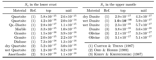 According to Weijermars & Schmeling (1986), rheological similarity also demands equality of the dimensionless stress exponents for natural and analogue materials. This exponent is between 1.8 and 5.1 for the materials shown in Table 2. For the paraffin waxes used, the measured data is consistent with n = 1. Rossetti et al. (1999) obtained similar low (n < 1.3) stress exponents, while Mancktelow (1988) gave values between 2.4 and 4.1. This value is only significant in scenarios with large gradients in the strain rate.