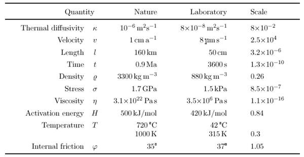 where η0 is the viscosity at a chosen temperature T0, couples the material properties viscosity and activation energy. In the experiments presented here, the scaling factors were determined by following the steps given in Table 3. A summary of the resulting scaling factors for the properties discussed above can be found in Table 4. Having chosen a material, the thermal diffusivity is given and the corresponding scaling factor is fixed. The limitations of the deformation apparatus set the velocity scale. From these two, the length and time scales were calculated. After that, limits for length of the natural scenarios to be modelled could be estimated from the possible initial lengths in the laboratory.