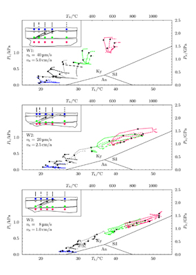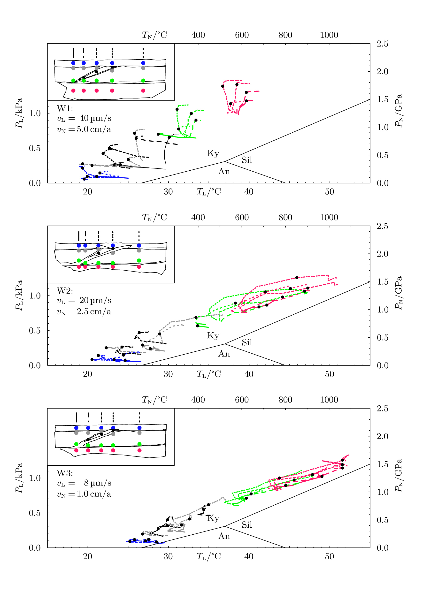 The points originally in the upper crust of the hinterland start with an isobaric temperature decrease, followed only by an isobaric temperature increase in the relaxation phase. For the fast experiment including a wedge (W1), the uppermost points of the lower crust behaved similarly. The clockwise form of the PTt paths has been described by England (1987) for diffuse continental deformation. The initial isobaric temperature decrease for the area described above has been predicted by England & Thompson (1984) and Thompson & England (1984) from numerical calculations for regions where the crust has been thickened by thrusting. Natural rocks in orogenic scenarios are brought to the surface by erosion. Therefore, they show a geothermal decrease of temperature and pressure at the end of the PTt path. This end (a straight line to the "surface" conditions, 20°C, 0 GPa) must be added to the paths shown in Figure 10.