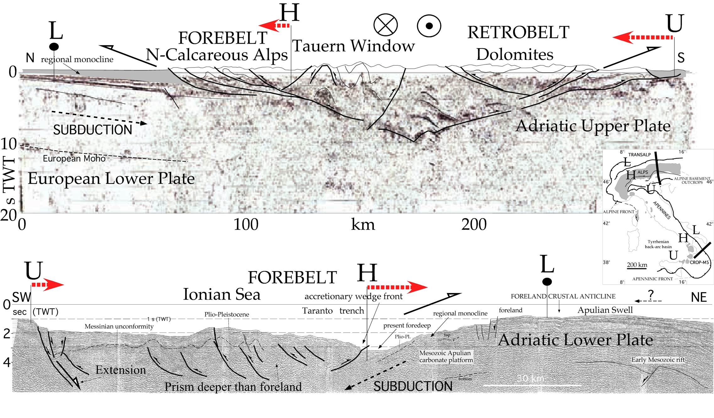 Note the Alpine double vergence (upper section), whereas the Apennines (lower section) have a single vergence. The Apennines prism is deeper than the foreland and characterized by extension at its rear (to the left). L, lower plate, H, subduction hinge, U, upper plate. Assuming fixed the lower plate (Europe for the Alps, and the Adriatic plate for the Apennines), the subduction hinge the subduction hinge is advancing towards the upper plate in the Alps and retreating in the Apennines.