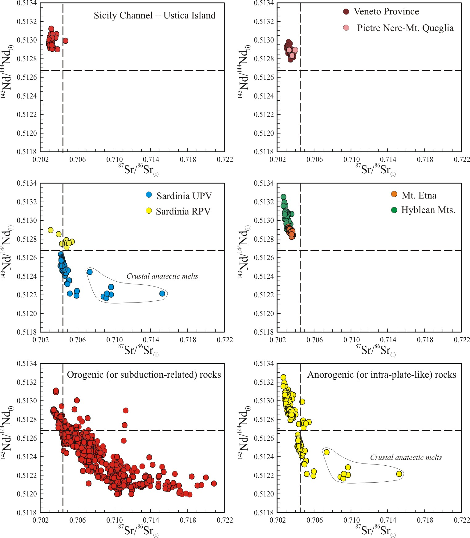 Top (a) = 143Nd/144Nd vs. 87Sr/86Sr initial isotopic ratios for the Cenozoic subduction-related (or “orogenic”) igneous rocks of Italy. BSE = Bulk Silicate Earth estimate (87Sr/86Sr = 0.70445). ChUR = Chondritic Uniform Reservoir estimate (143Nd/144Nd = 0.51264).