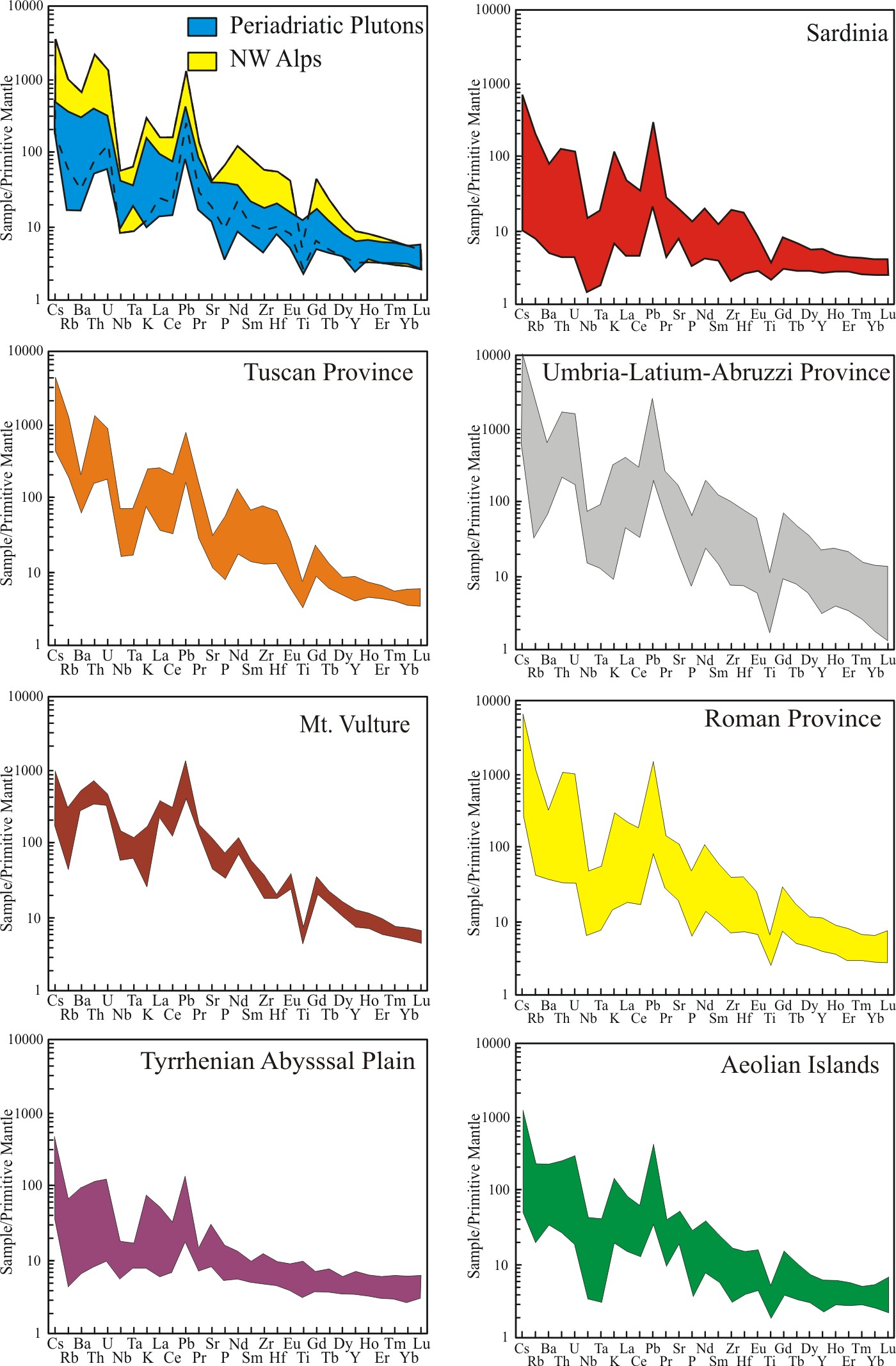 Figure 20. Primitive mantle-normalized multielemental diagram of the most mafic Italian Cenozoic igneous rocks