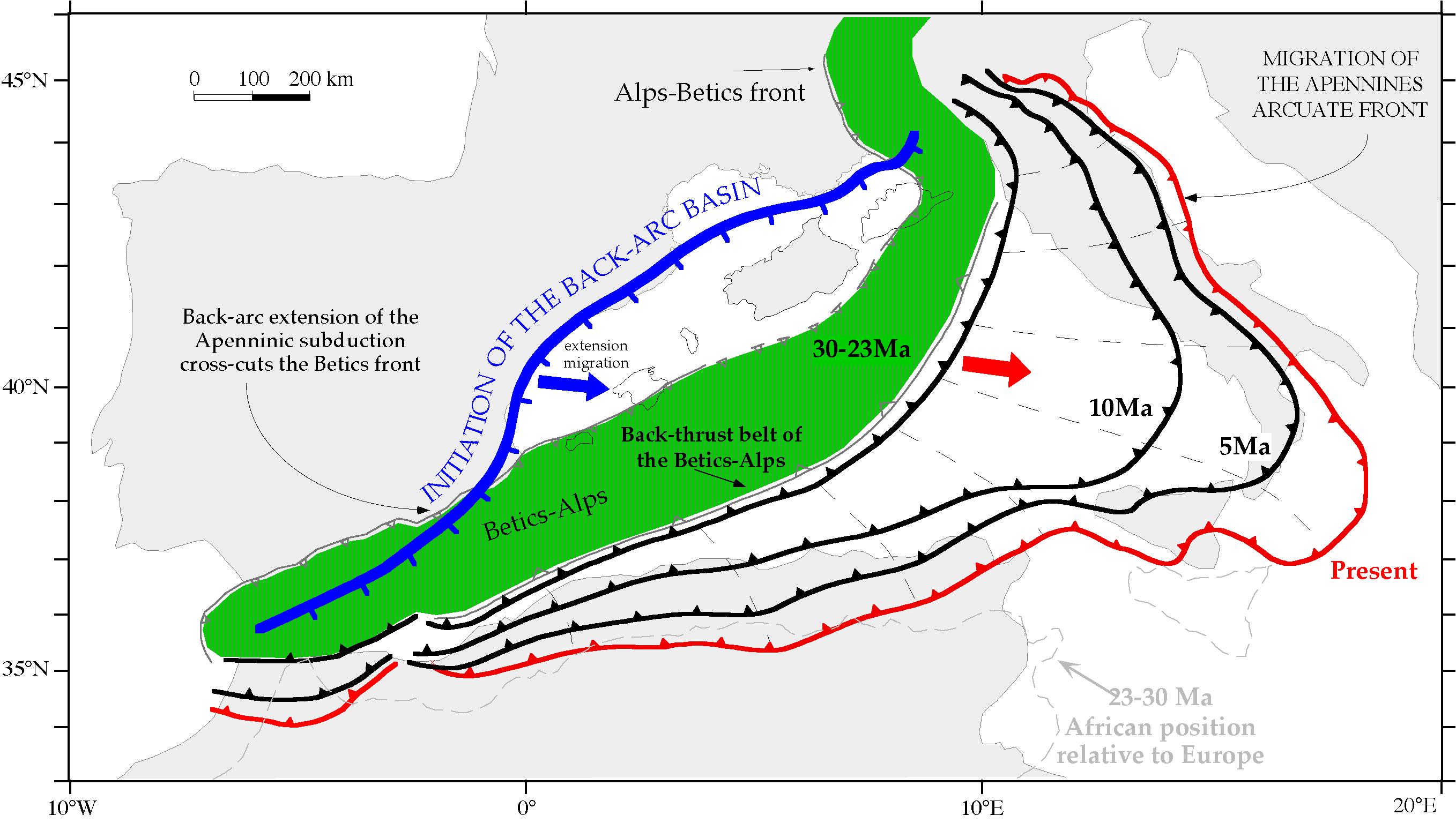 The Apennines arc migrated eastward up to the present position in association with the slab retreat. The western Mediterranean back-arc basins developed in the hangingwall of this retreating slab. Note the lengthening of the arc which should generate also along arc extension. The western border of the back-arc rifting has a convex shape, mirroring the opposite Apennines arc. The initial rift cross-cuts the Alpine-Betic front, suggesting that the extension is not simply the collapse of the Alps-Betics orogen (after Doglioni et al., 1999).