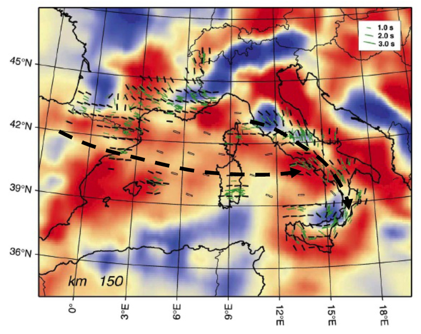 Note the alignment of the anisotropy (SKS splitting measurements) with the supposed mantle flow shown with the thick dashed black line in the hangingwall of the W-directed, easterly retreating Apennines slab. The inferred flow tends to parallel the slab when approaching the Apennines subduction zone, suggesting the presence of an obstacle able to deviate the mantle flow.